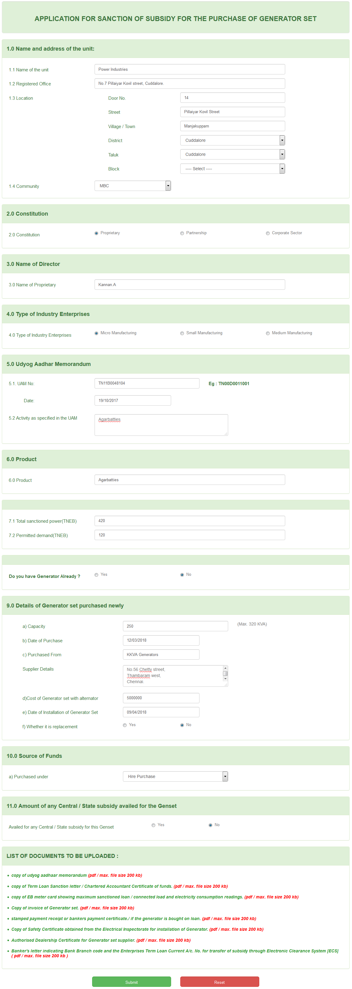 ONLINE FILLED APPLICATION UNDER GENSET SUBSIDY