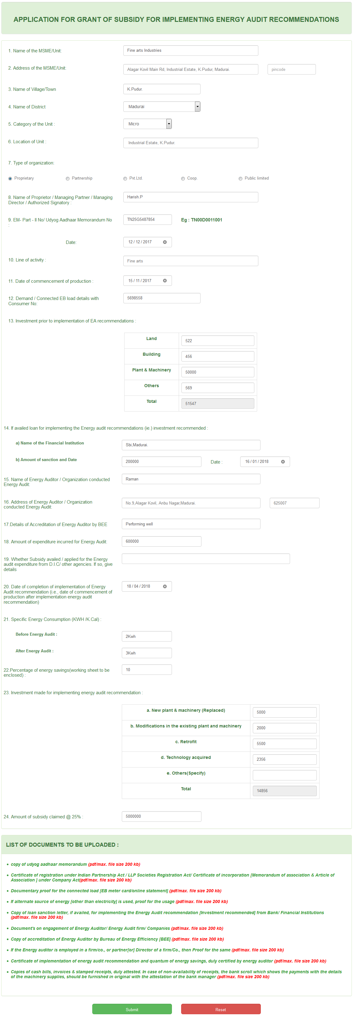 ONLINE FILLED APPLICATION UNDER IMPLEMENTING ENERGY AUDIT SUBSIDY