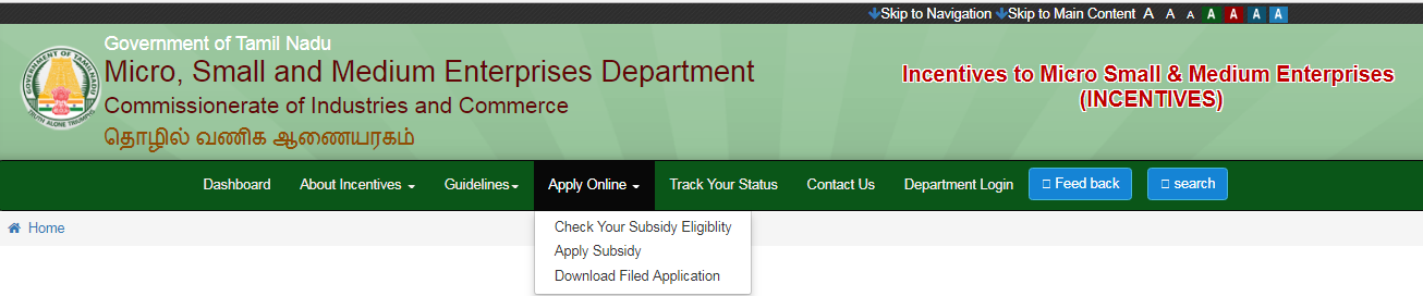 In the home page select "Apply online" tab in the dropdown box select "apply for subsidy" option. A submenu will be displayed, from which select Capital subsidy option.