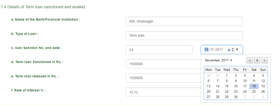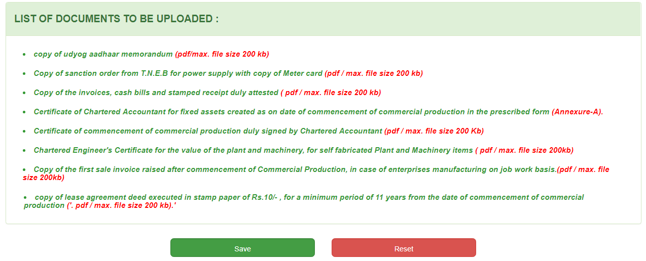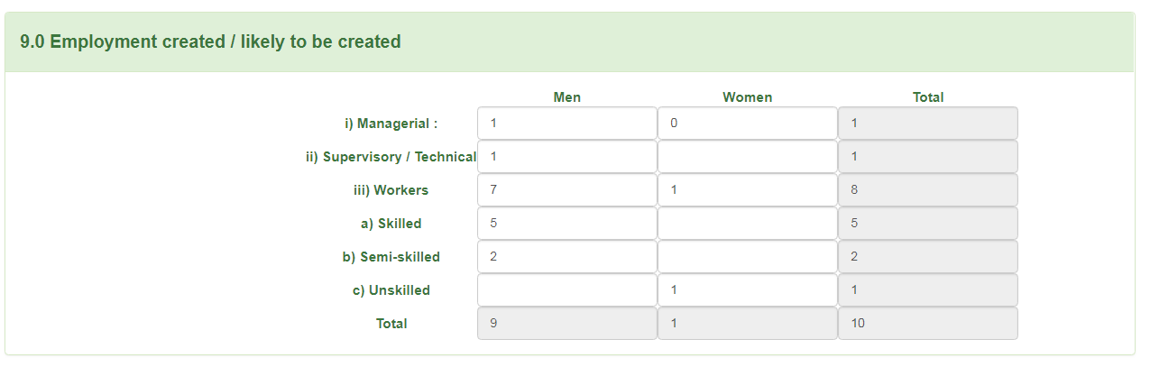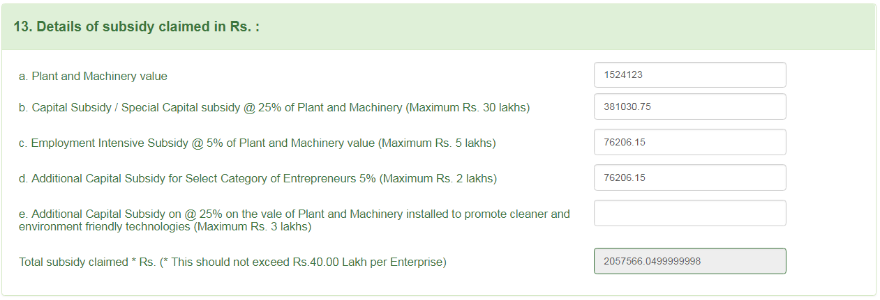 System will automatically calculate the following data from the details furnished by you. However, the amount of subsidy mentioned against each component is only indicative. The actual amount of subsidy will be arrived at only after processing the application along with enclosures and verifying the availability of machinery in the factory premises and the functioning of the unit.