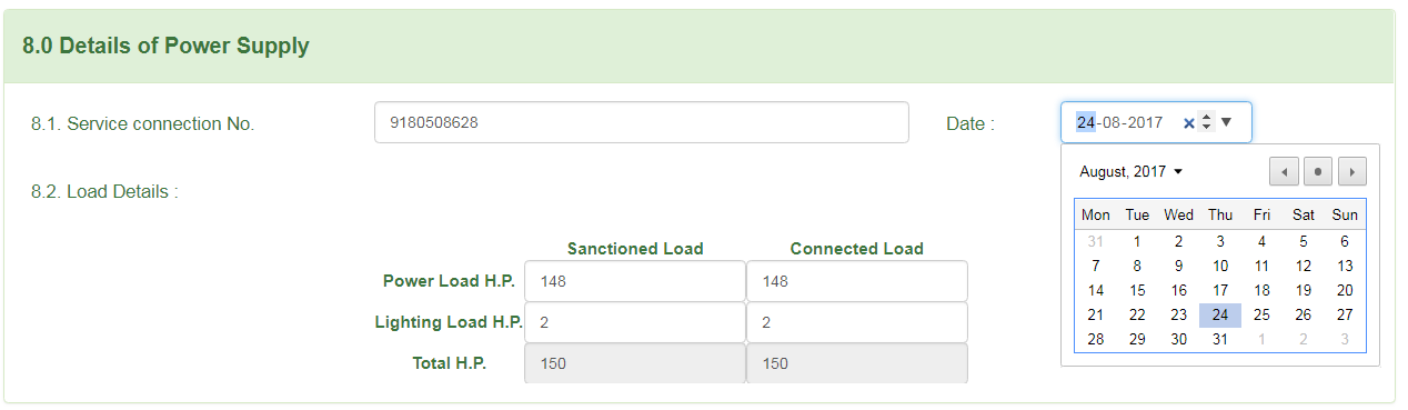 Fill in the details of Power Supply Service, connection no. & Date and Load Details in the respective Boxes.