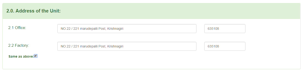 Fill in the details of the Address of the Unit: such as door no, street name, Village name and District name in the space provided for office address and factory address