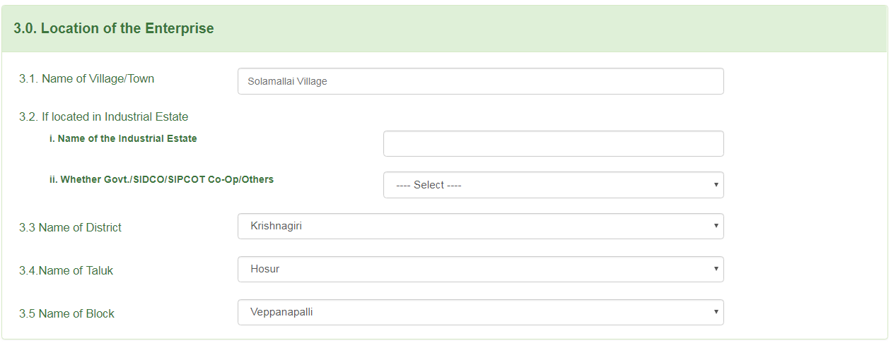 Enter the details of the Enterprise such as village/town, whether located in industrial estate or not, name of the Name of Block, Name of Taluk and Name of District.