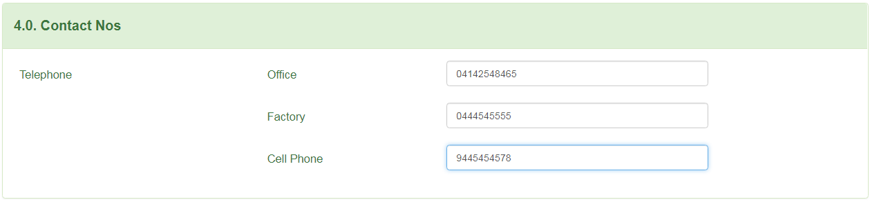 Fill in the details of the Contact Nos of Office, Factory, and Cell Phone.